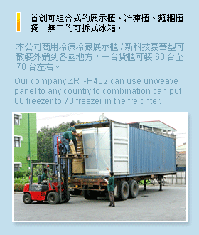 展佳冷凍科技企業有限公司在專業製造廠的領導下、追求時代進步的創新、研發出各式各樣不同用途的冷凍冷藏玻璃展示櫃、WALK-IN後補式展示櫃、不鏽鋼凍庫、不鏽鋼麵糰、不鏽鋼工作台、保鮮櫃、蛋糕櫃、各式開放式直立式生鮮櫃、熟食櫃、冷凍臥櫃、上冷藏下冷凍子母櫃、壽司櫃、後補式開放櫃、OPEN SHOWCASE、REACH-IN SHOWCASE、組合式拼裝庫、植物生長箱……等產品,並可針對客戶需求,專案開發特殊產品,是一家專業可信賴的設計製造公司。本公司自1978年成立以來,即不斷以創新開發可拆式組合式的展示櫃,多年來更與許多國際廠商技術合作、取得國內外多項專利,並於1991年成功獨家首創高品質可折式組合式展示櫃、不鏽鋼凍庫、不鏽鋼麵糰櫃、可拆式冰箱,且也可以依客戶需求設計開發,以提供市場的需求,展佳科技一直以來的堅持以品質第一,顧客至上,優質完善的服務,陪伴客戶共同成長,是我們永續經營的理念,展佳科技是為您創造利潤的最佳夥伴。
